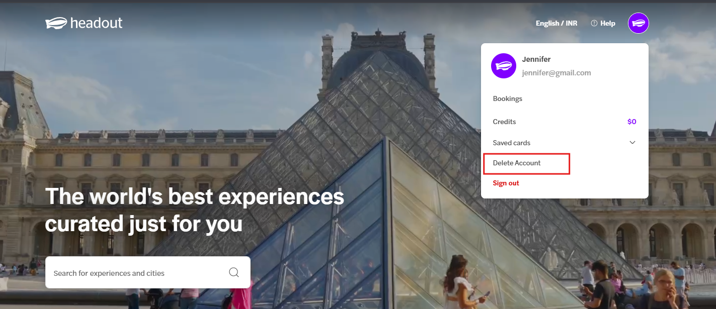 - En la aplicación de Headout: toca el icono Cuenta (abajo a la derecha) → ve a Configuración → selecciona Eliminar cuenta.